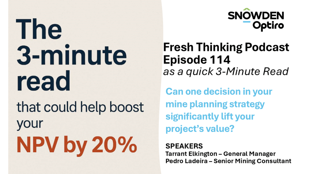 In this episode, Senior Mining Consultant Pedro Ladeira chats with Tarrant Elkington, General Manager and optimisation expert at Snowden Optiro, about the often-overlooked power of cutoff grade optimisation – and how, done well, it can boost a project’s Net Present Value (NPV) by up to 20%.